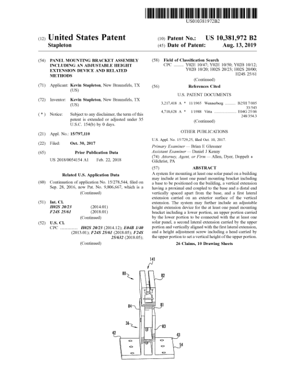 This is one of 13 patents related to solar panel installation. Would like to sell or license all of them in a package deal. Please send me a message for further information.