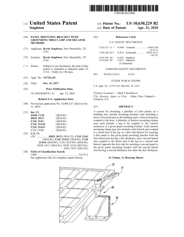 This is one of 13 patents related to solar panel installation. Would like to sell or license all of them in a package deal. Please send me a message for further information.